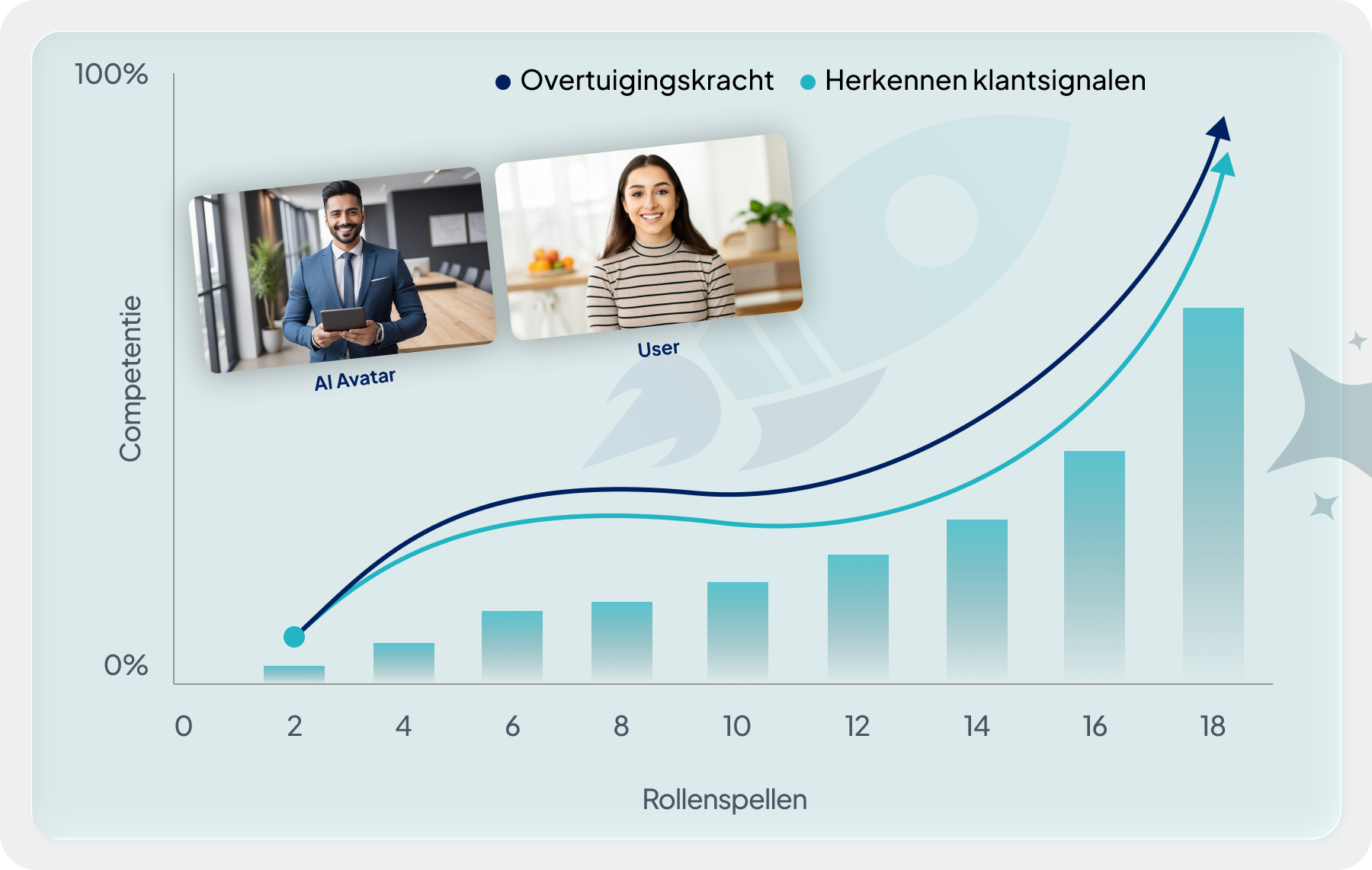 Je oefent heel realistisch, waar en wanneer je wilt. Geen inhuurkosten, geen wachttijden. De AI is altijd beschikbaar en geeft directe, consistente feedback gebaseerd op je werkelijke gedrag.