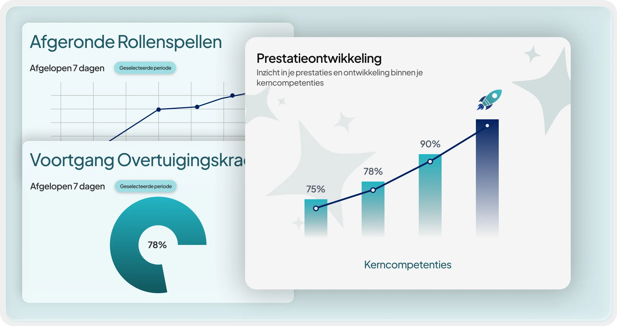 Elke medewerker werkt aan zijn ontwikkeling via een persoonlijk dashboard dat inzicht geeft in competenties, prestaties en gerichte feedback. Het voordeel? De AI-salescoach is 24/7 beschikbaar en vertaalt deze inzichten naar concrete ontwikkelacties die schaalbaar en objectief zijn.